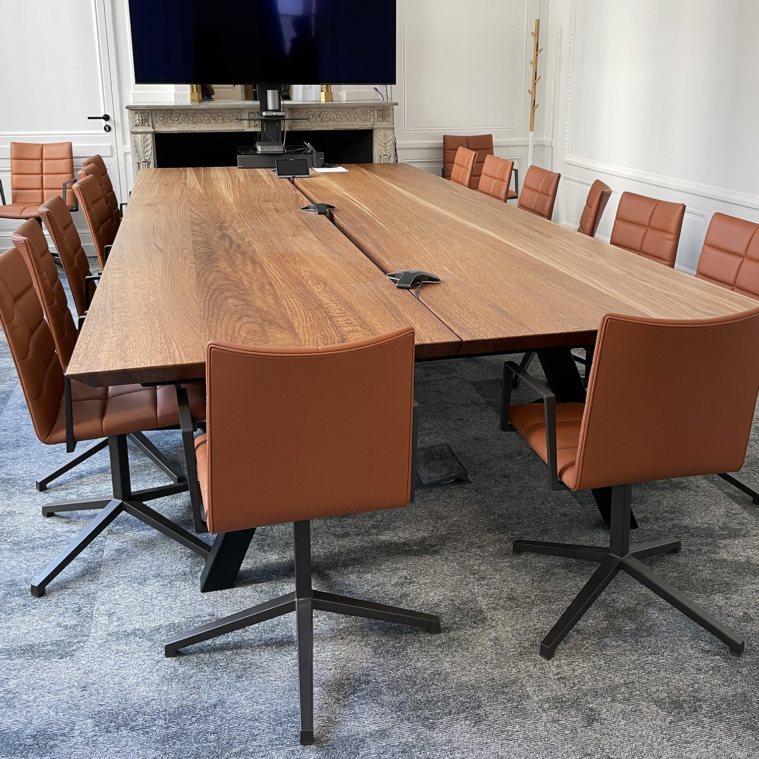 Conception de l’aménagement mobilier d’un espace de bureaux proposant différentes configurations de travail dans un superbe immeuble haussmannien classique d’un quartier historique parisien.