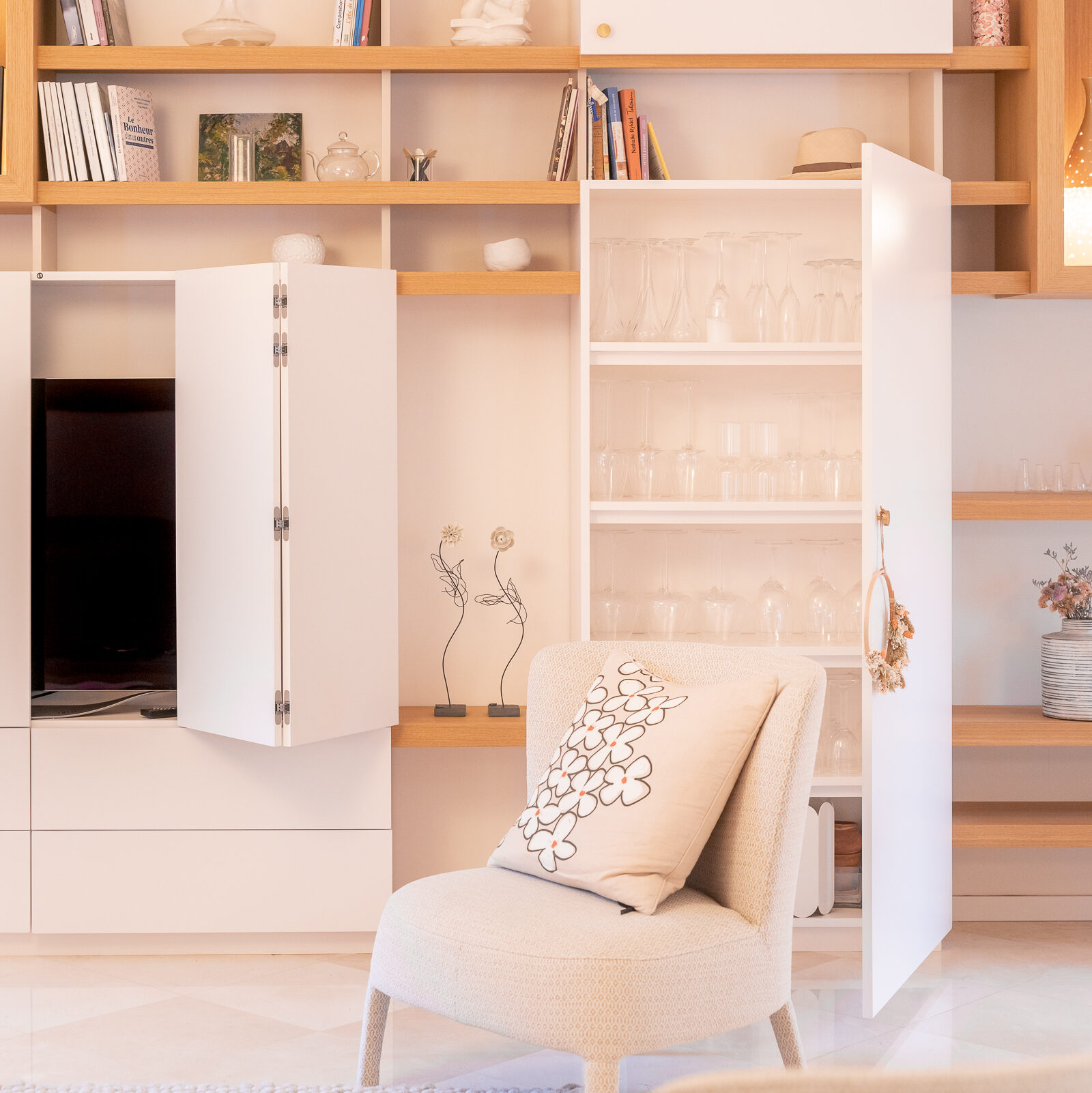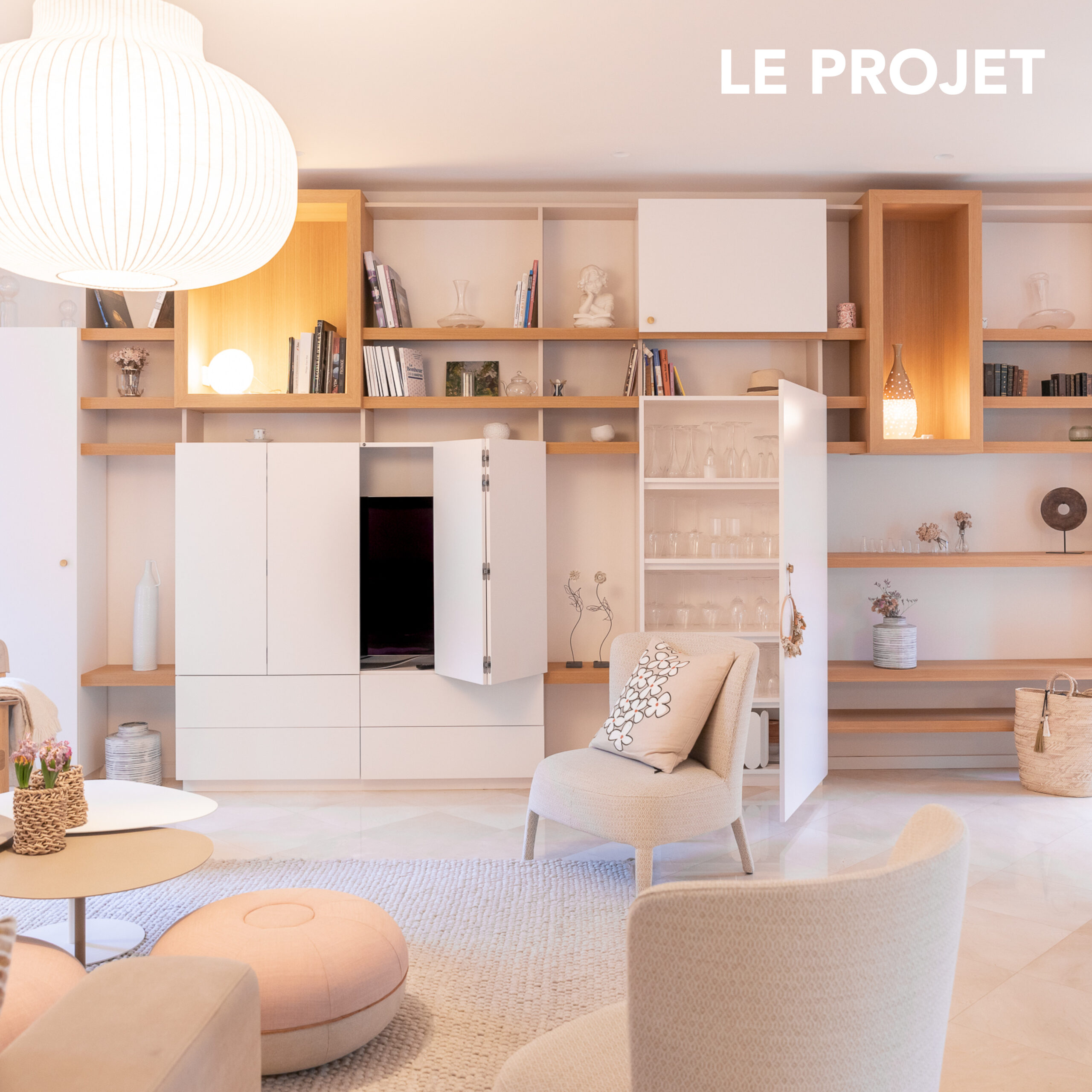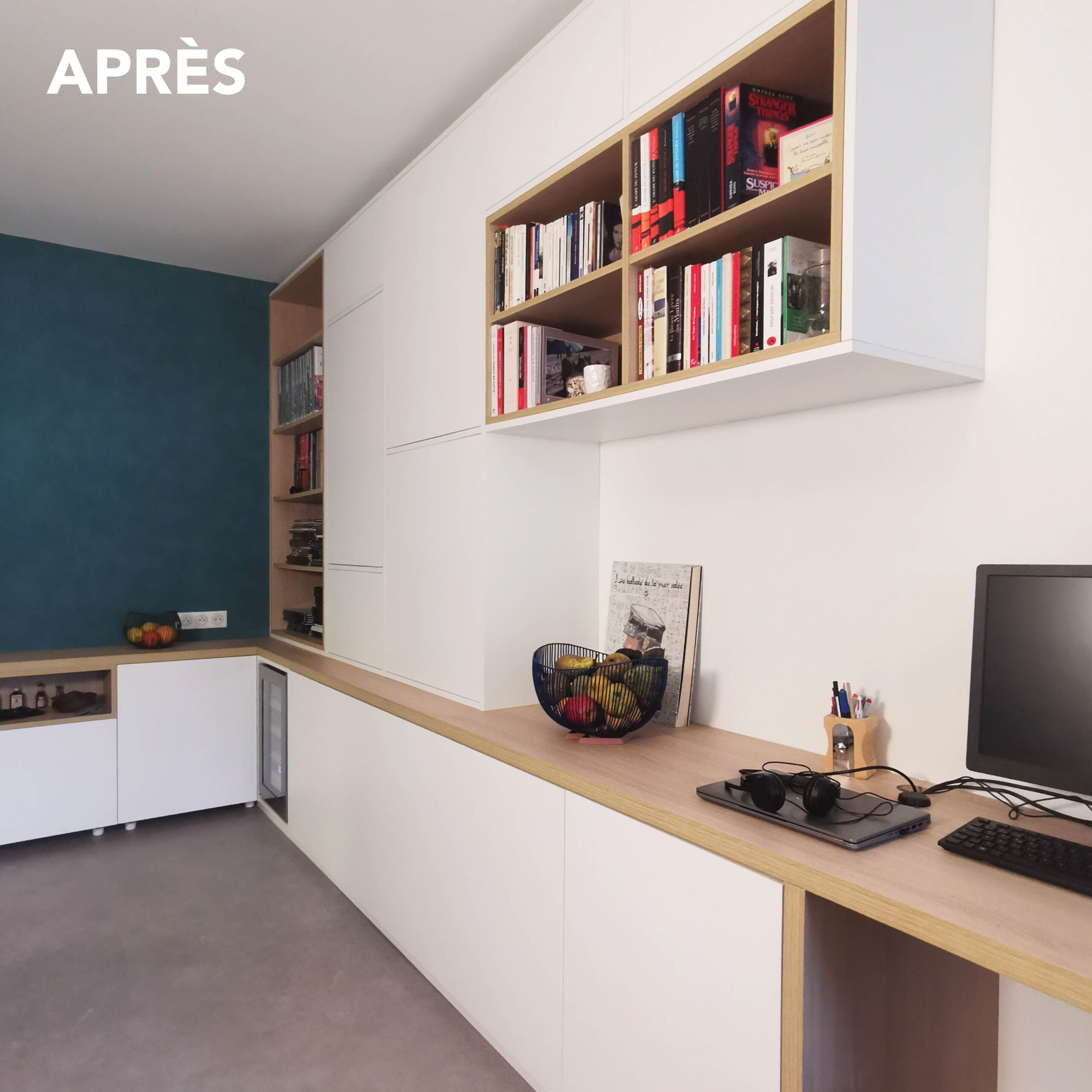 Réinventer un espace de télétravail et optimiser les rangements dans une grande pièce à vivre. Création de 2 grands meubles sur-mesure alliant fonctionnalité et design.