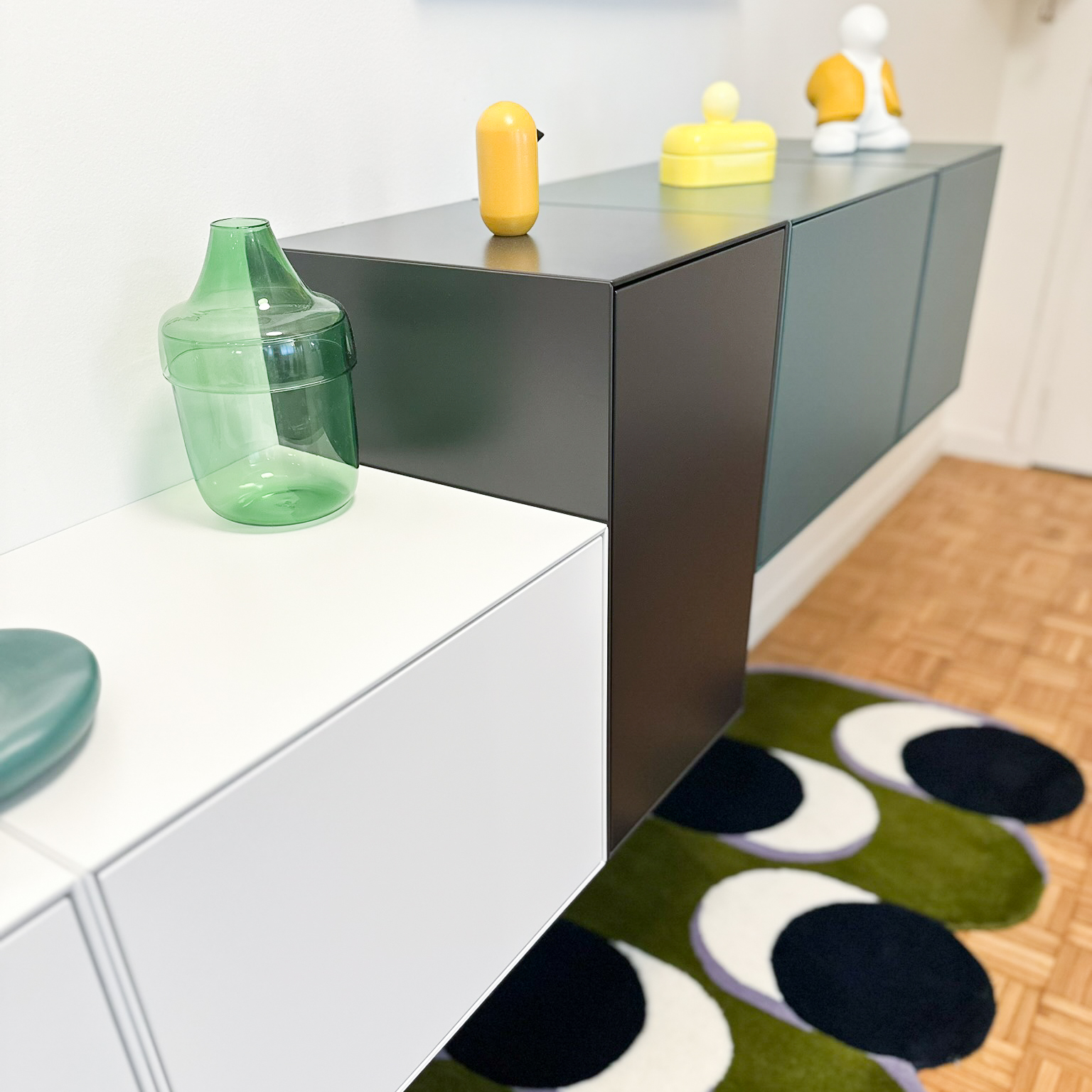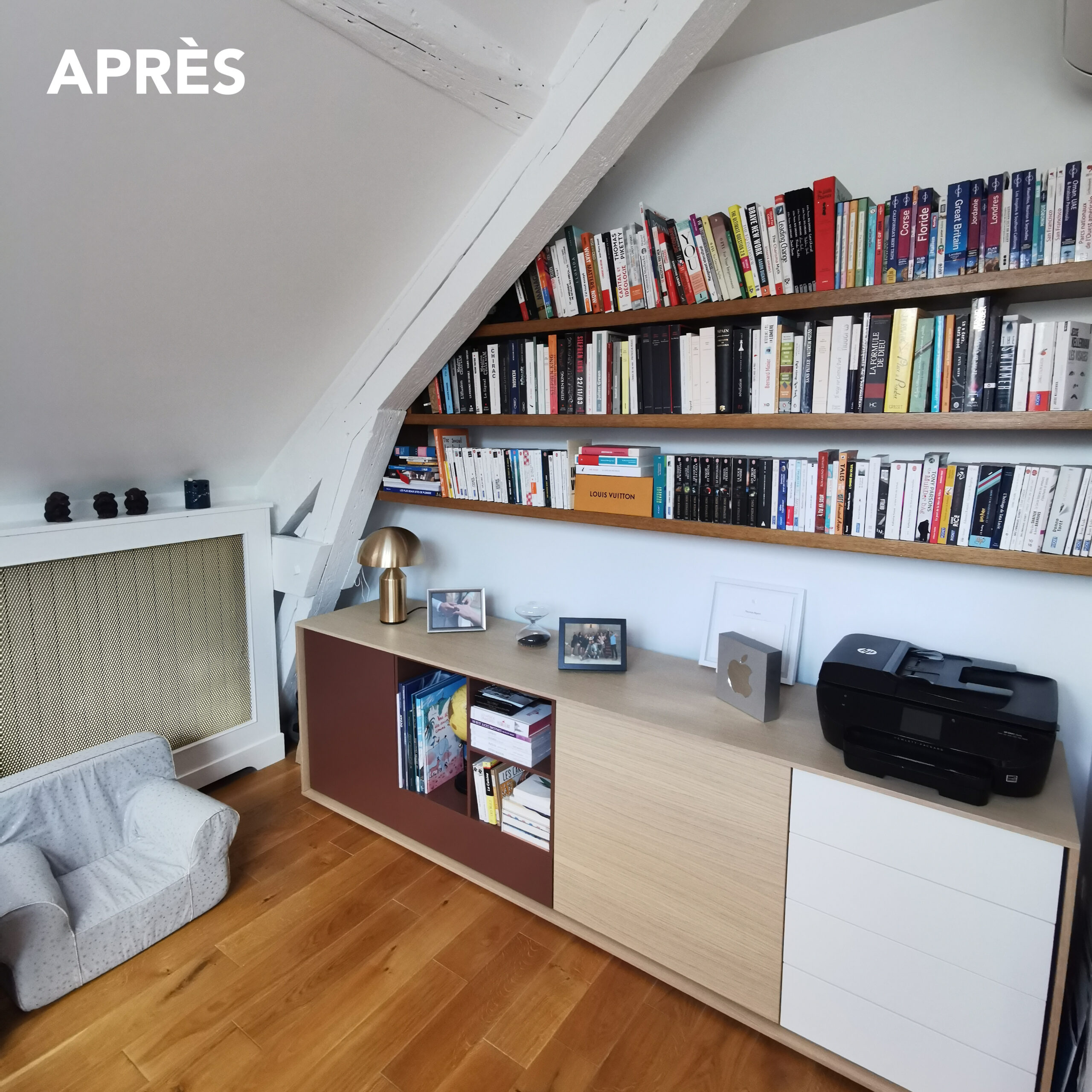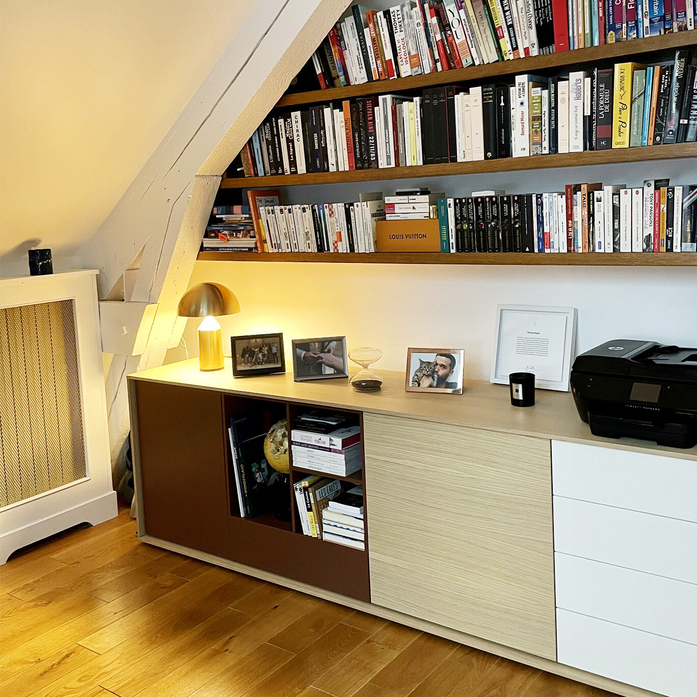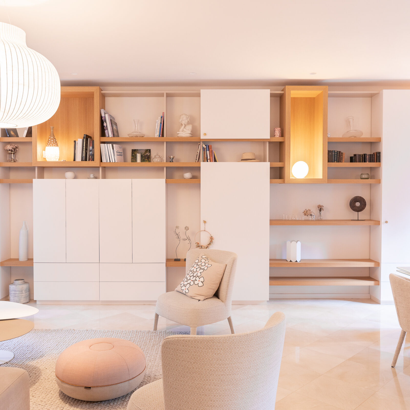Réinventer un espace de télétravail et optimiser les rangements dans une grande pièce à vivre. Création de 2 grands meubles sur-mesure alliant fonctionnalité et design.