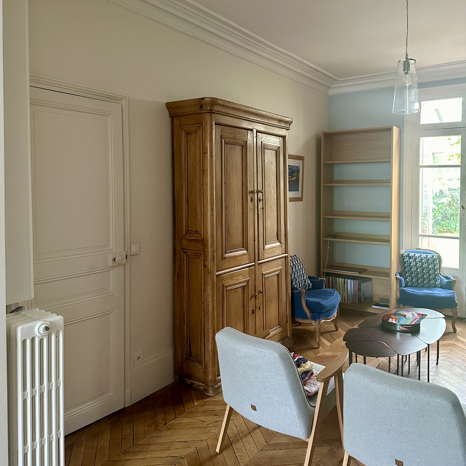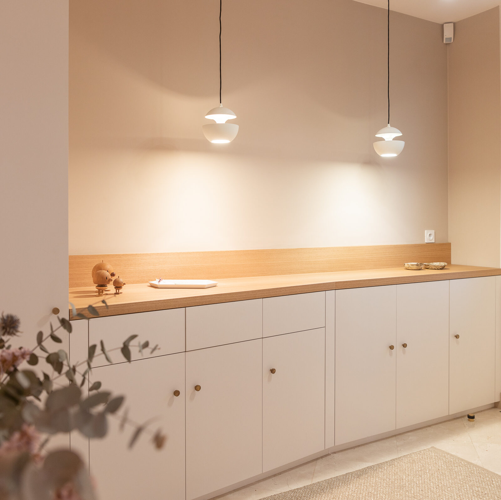 Au rez-de-chaussée, création d’un meuble d’entrée sur-mesure avec rangements à chaussures en partie basse et penderie en partie haute, pour les enfants et les adultes. L’espace a été réorganisé pour ouvrir la circulation entre salle à manger et salon, et repeint pour plus de lumière et d’unité.