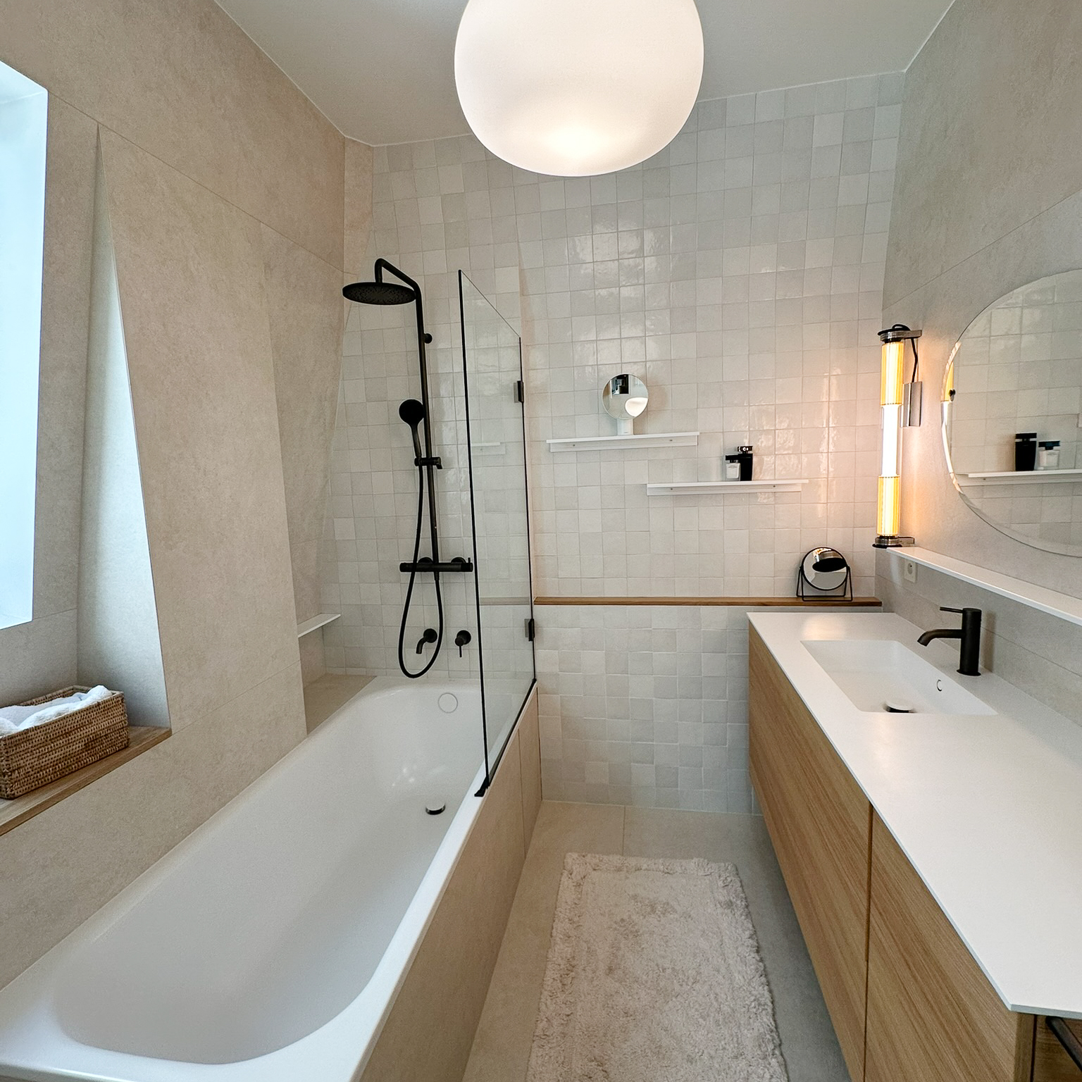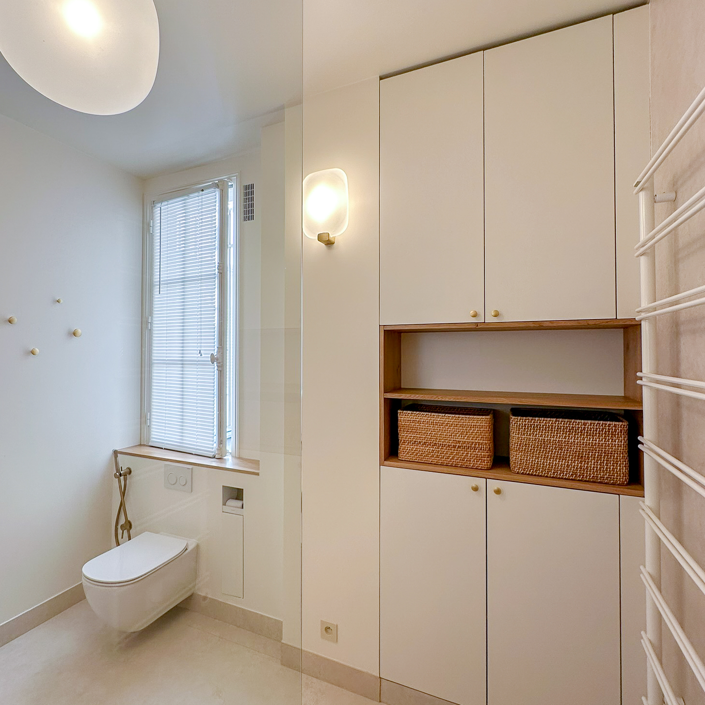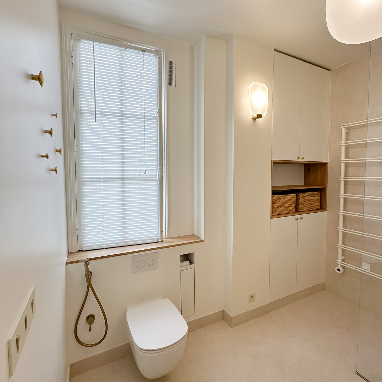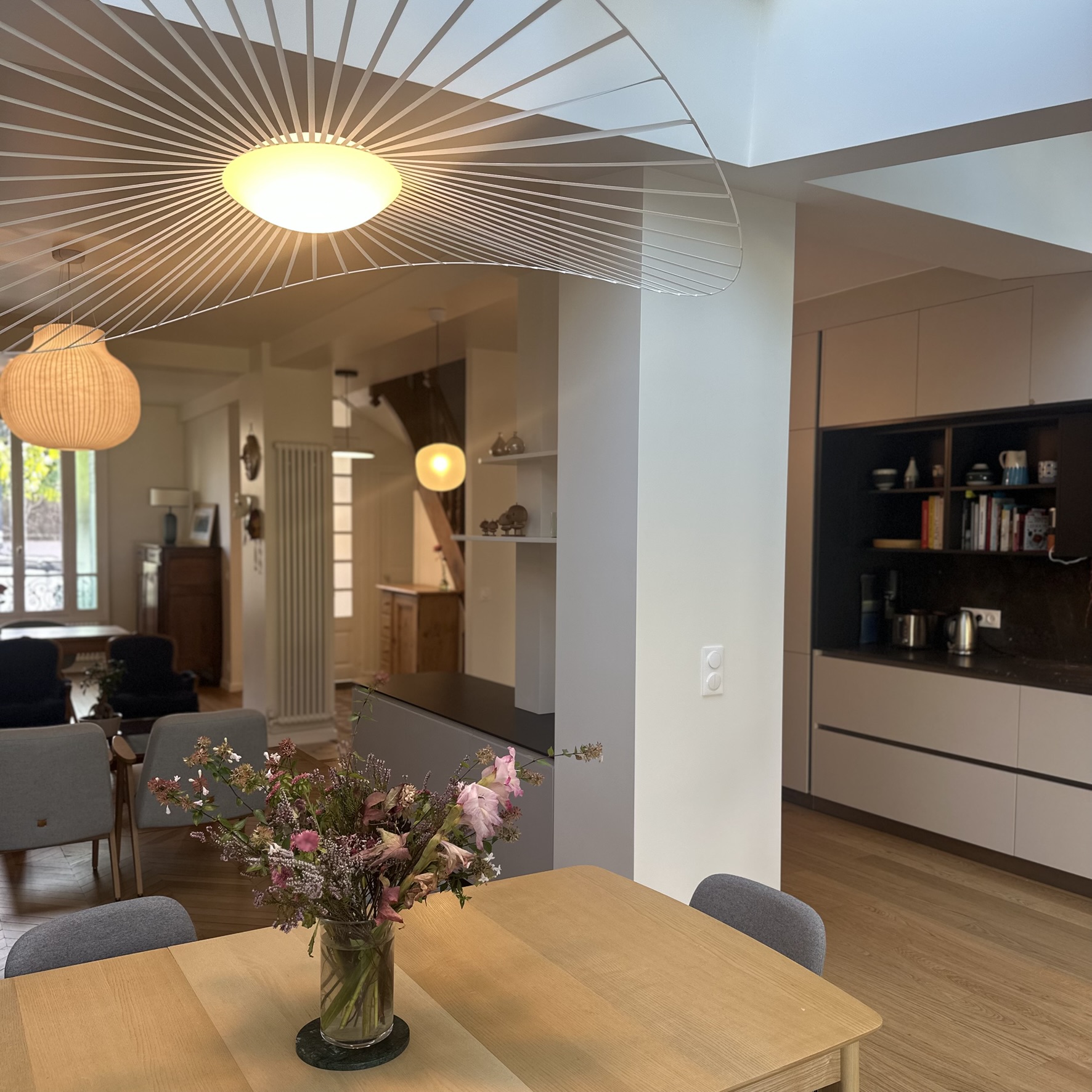 À l’étage, rénovation de la suite parentale avec salle de bain sur mesure : grandes dalles en grès cérame marbré, touches de noyer et robinetterie en laiton pour un espace lumineux et élégant.Une sélection de mobiliers, luminaires et accessoires vient sublimer chaque espace et révéler l’harmonie de l’ensemble.
