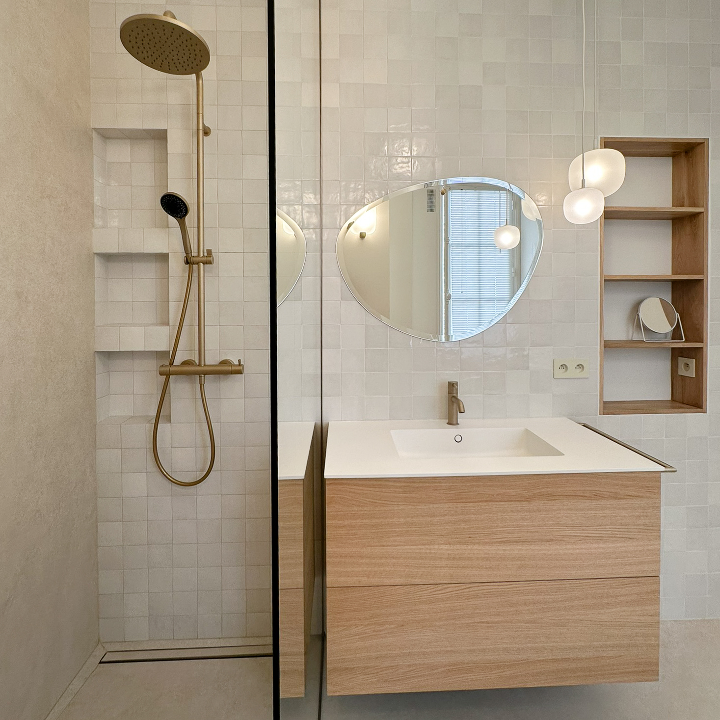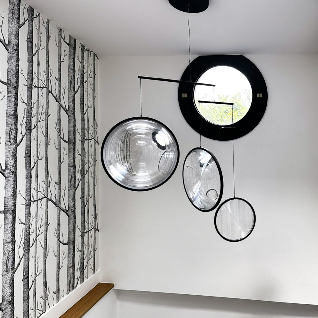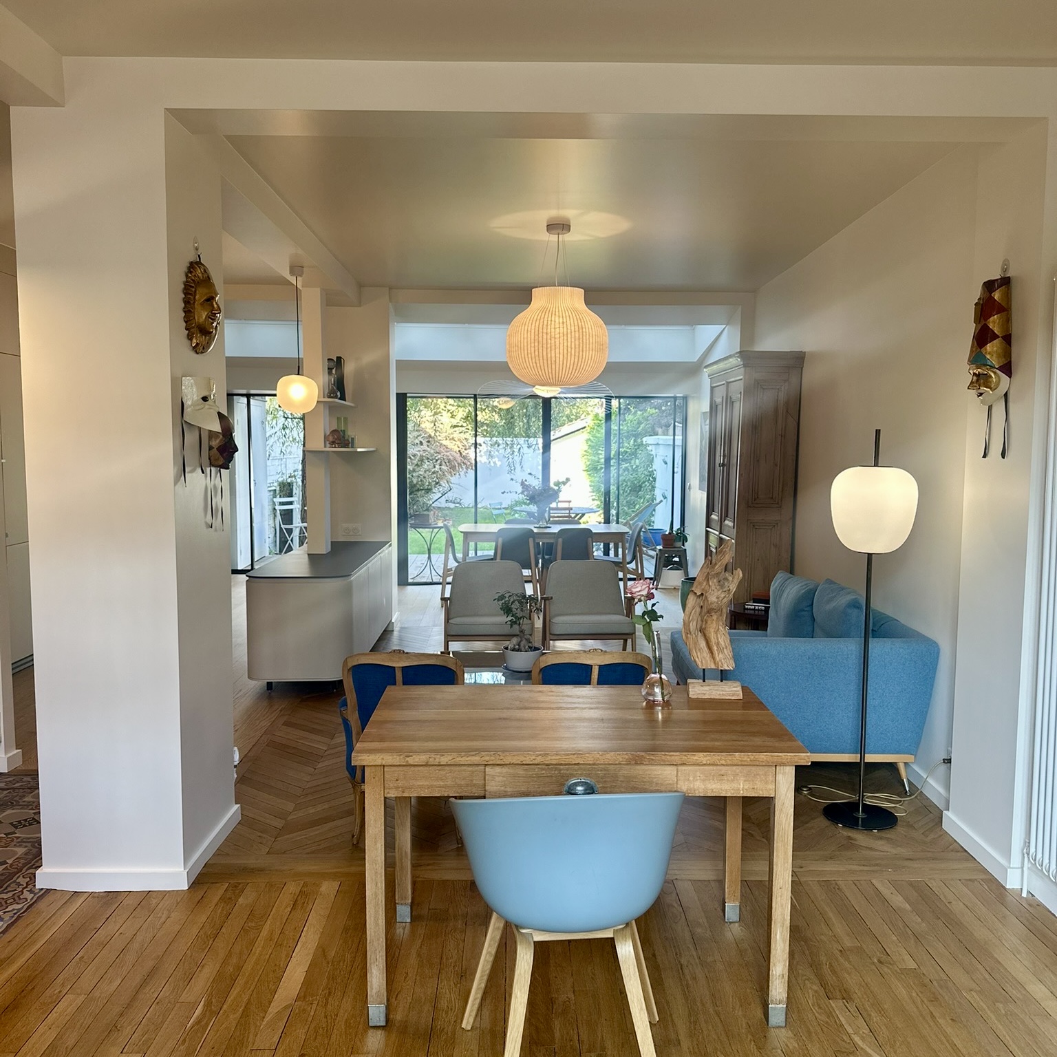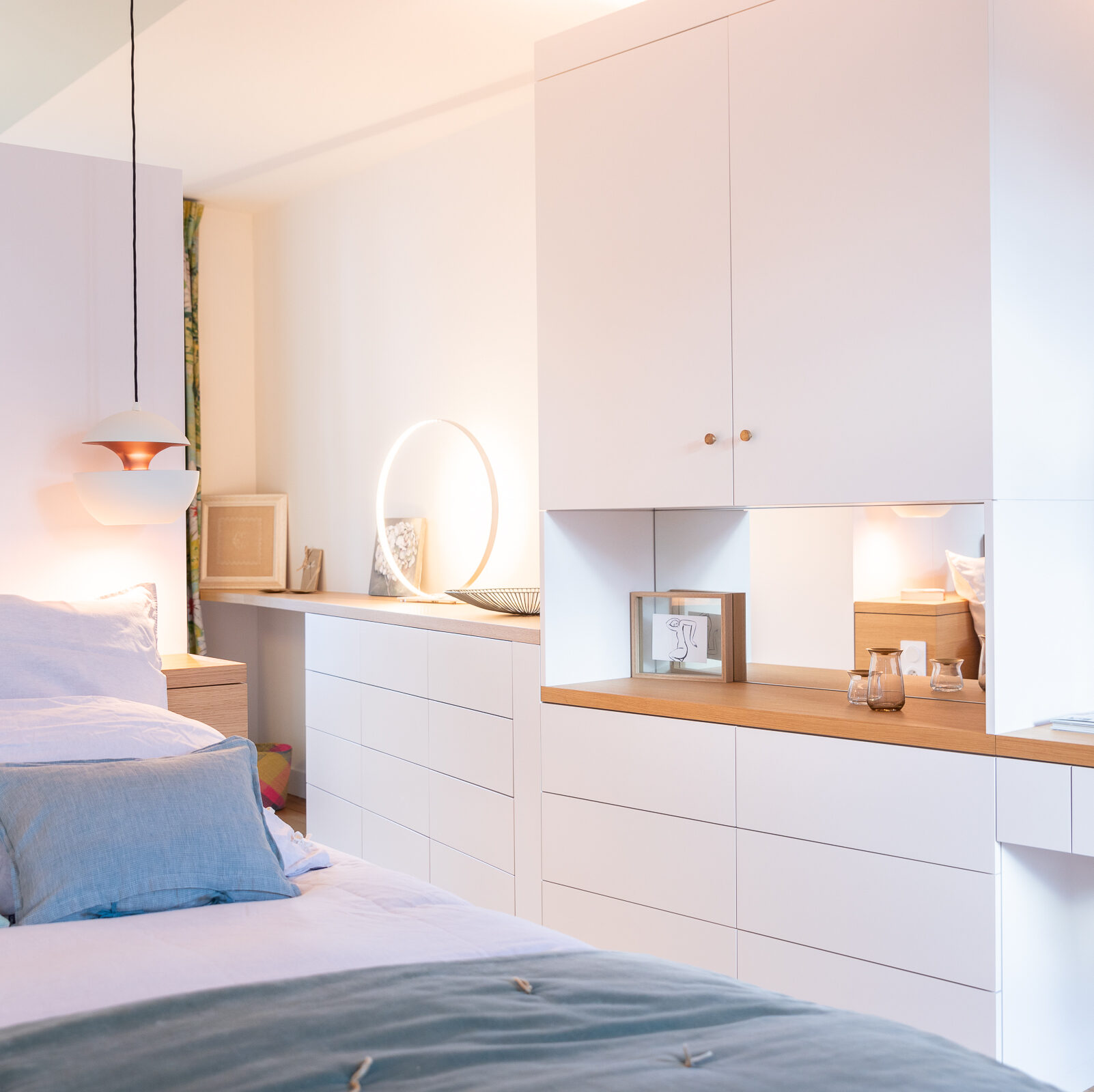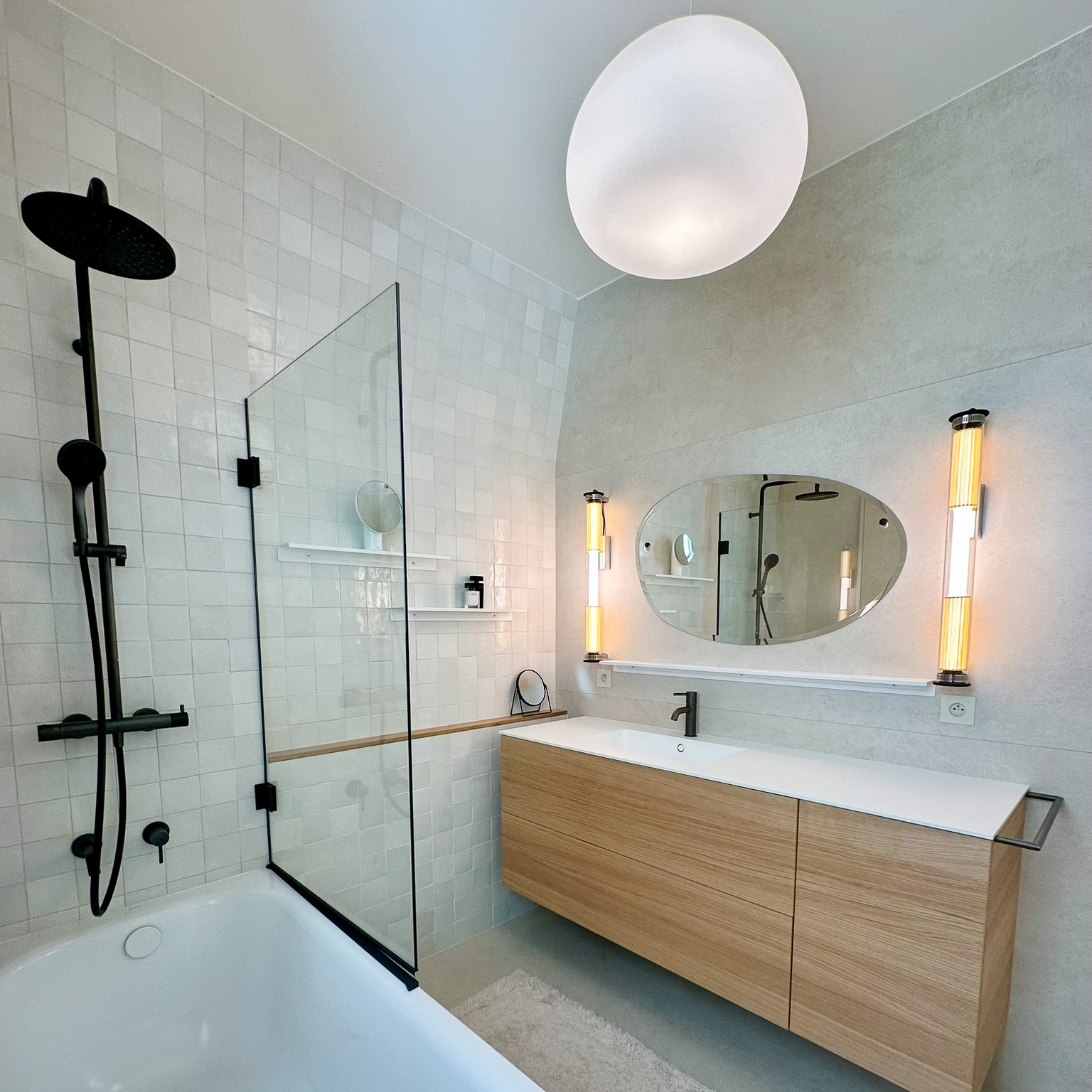 À l’étage, rénovation de la suite parentale avec salle de bain sur mesure : grandes dalles en grès cérame marbré, touches de noyer et robinetterie en laiton pour un espace lumineux et élégant.Une sélection de mobiliers, luminaires et accessoires vient sublimer chaque espace et révéler l’harmonie de l’ensemble.
