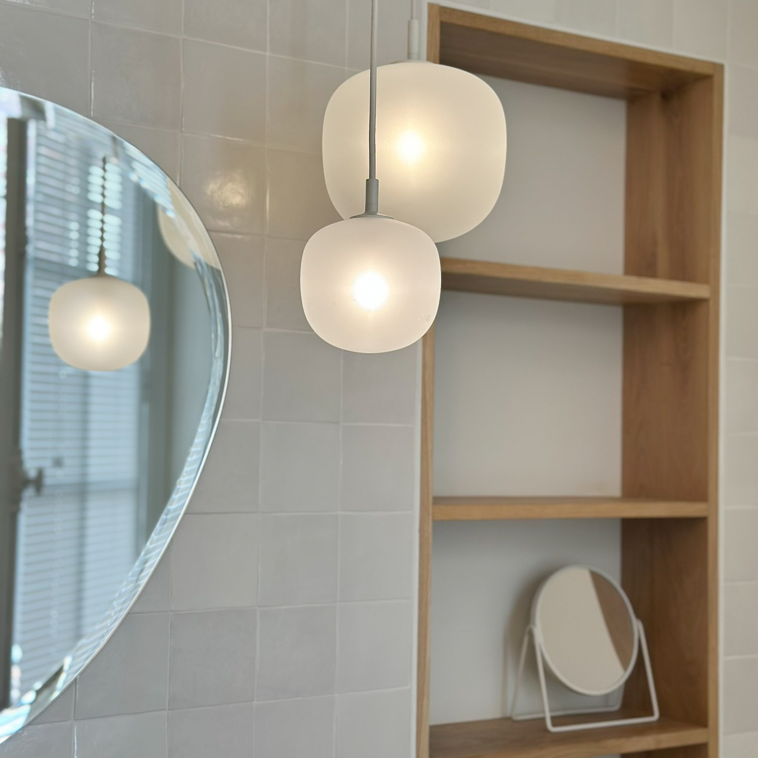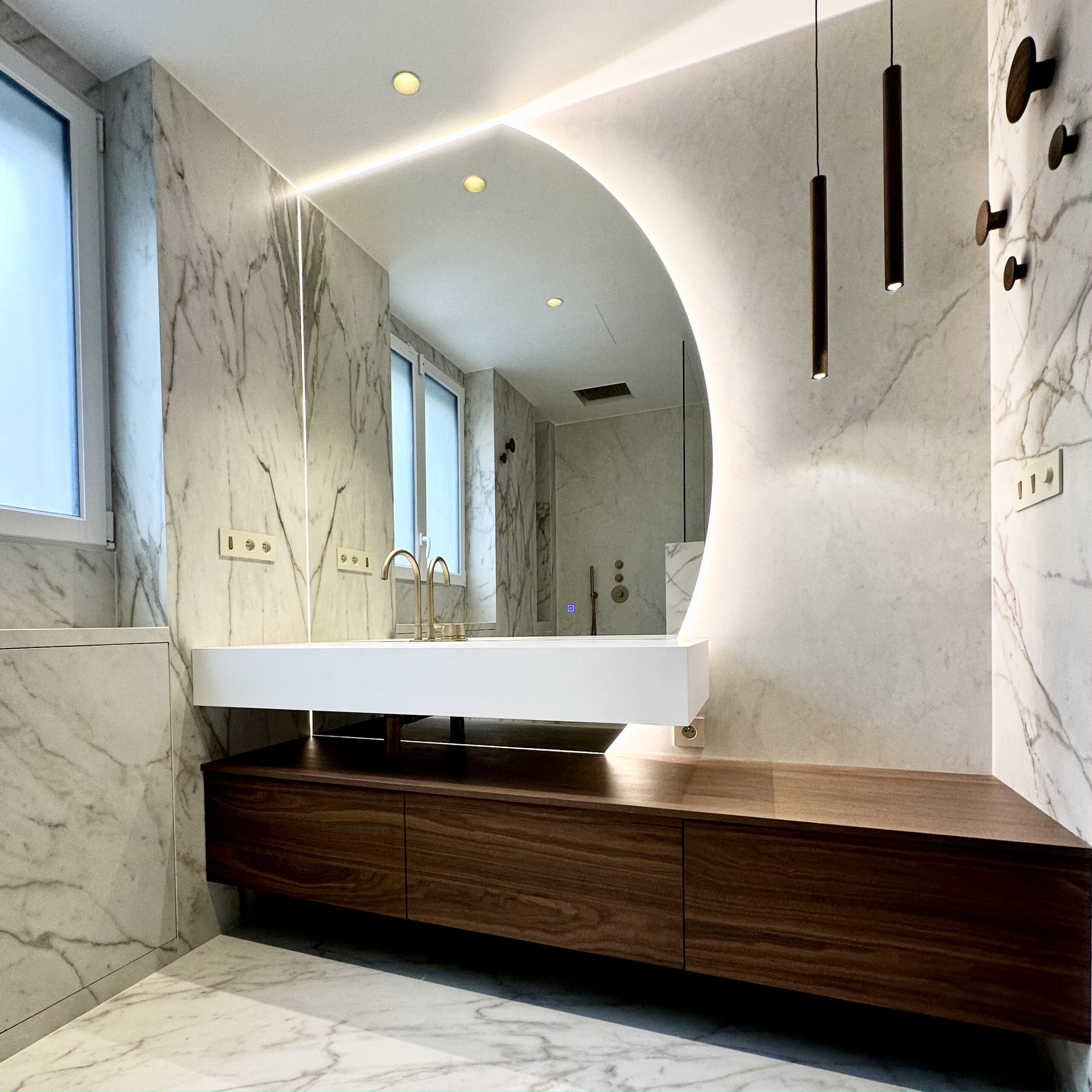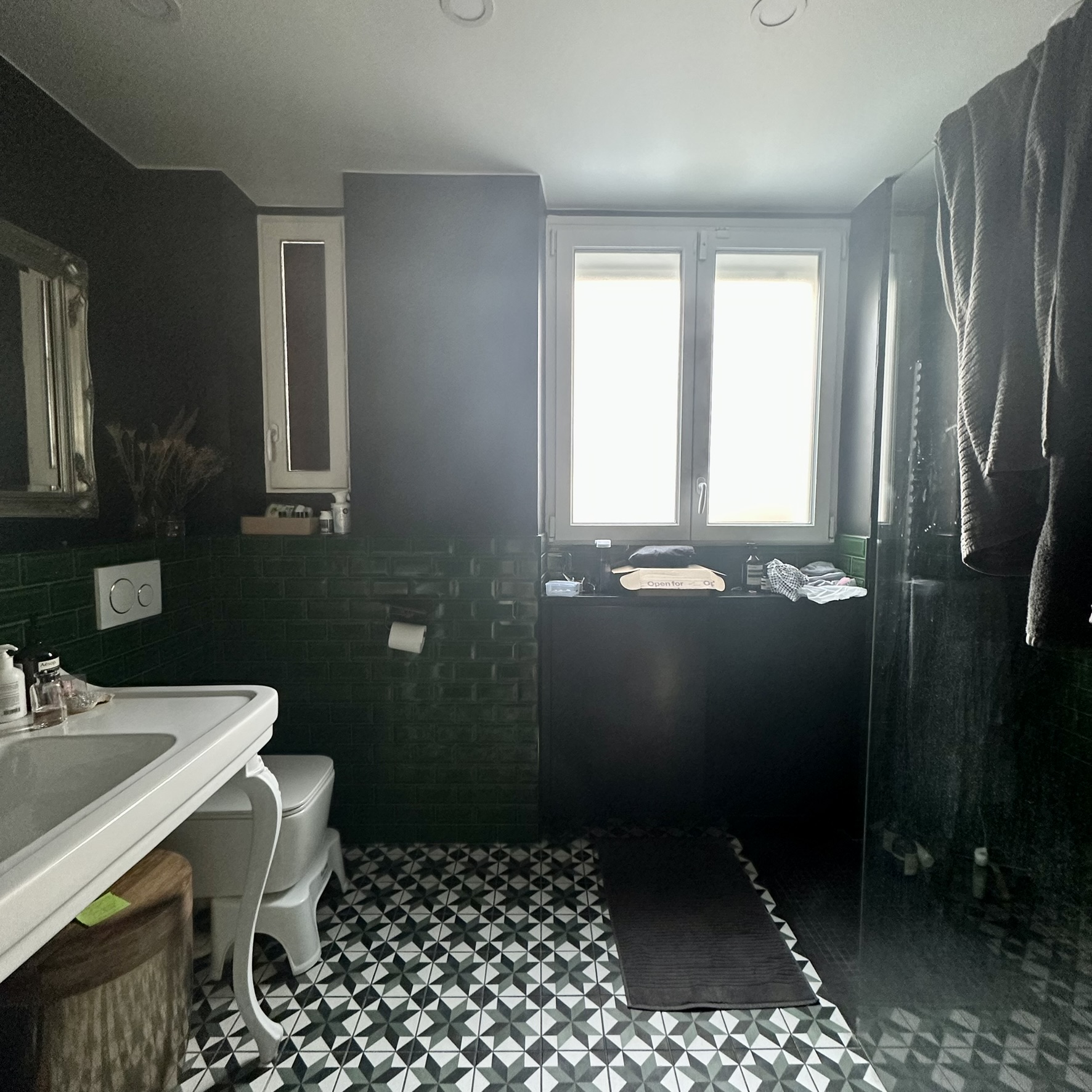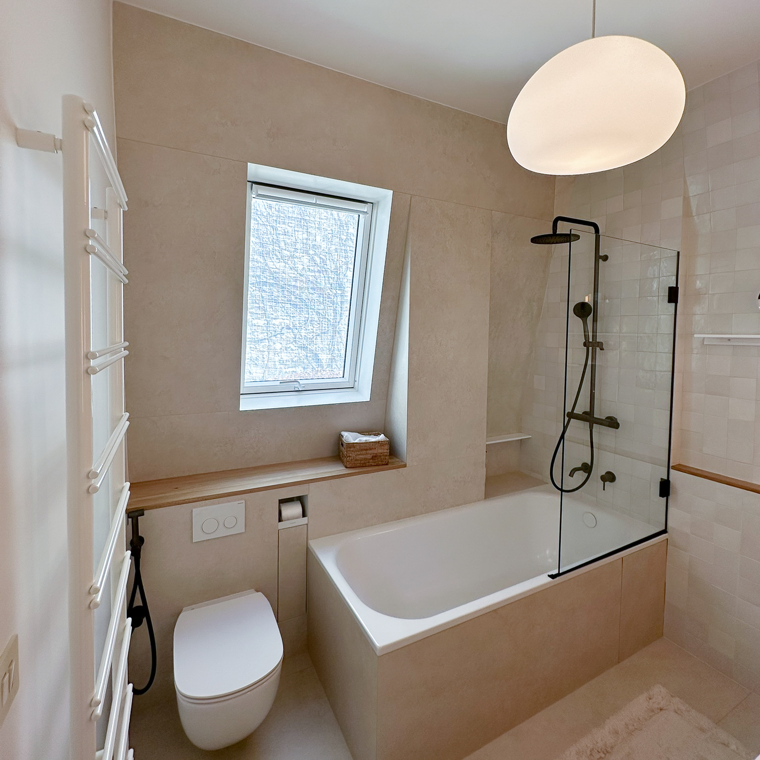 À l’étage, rénovation de la suite parentale avec salle de bain sur mesure : grandes dalles en grès cérame marbré, touches de noyer et robinetterie en laiton pour un espace lumineux et élégant.Une sélection de mobiliers, luminaires et accessoires vient sublimer chaque espace et révéler l’harmonie de l’ensemble.