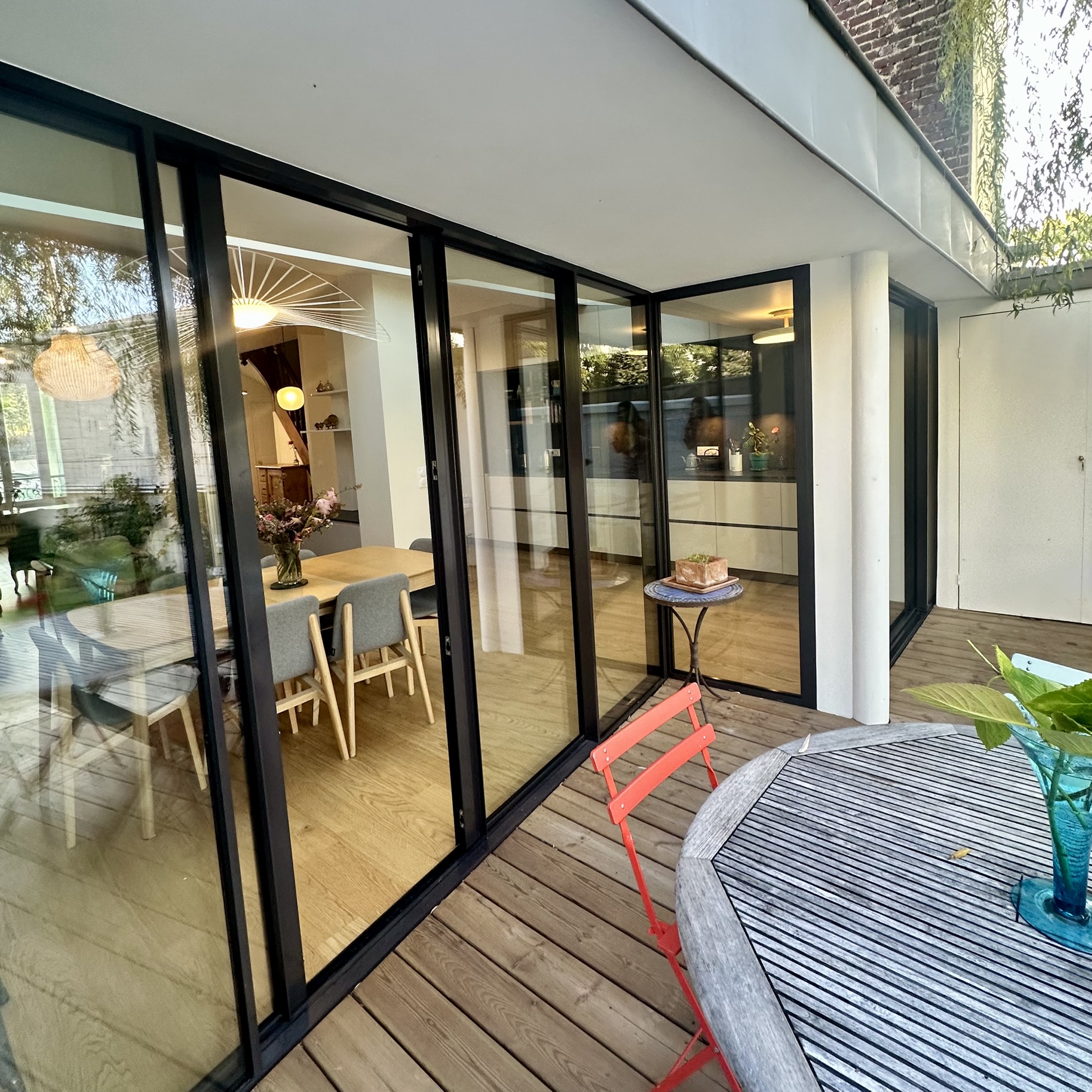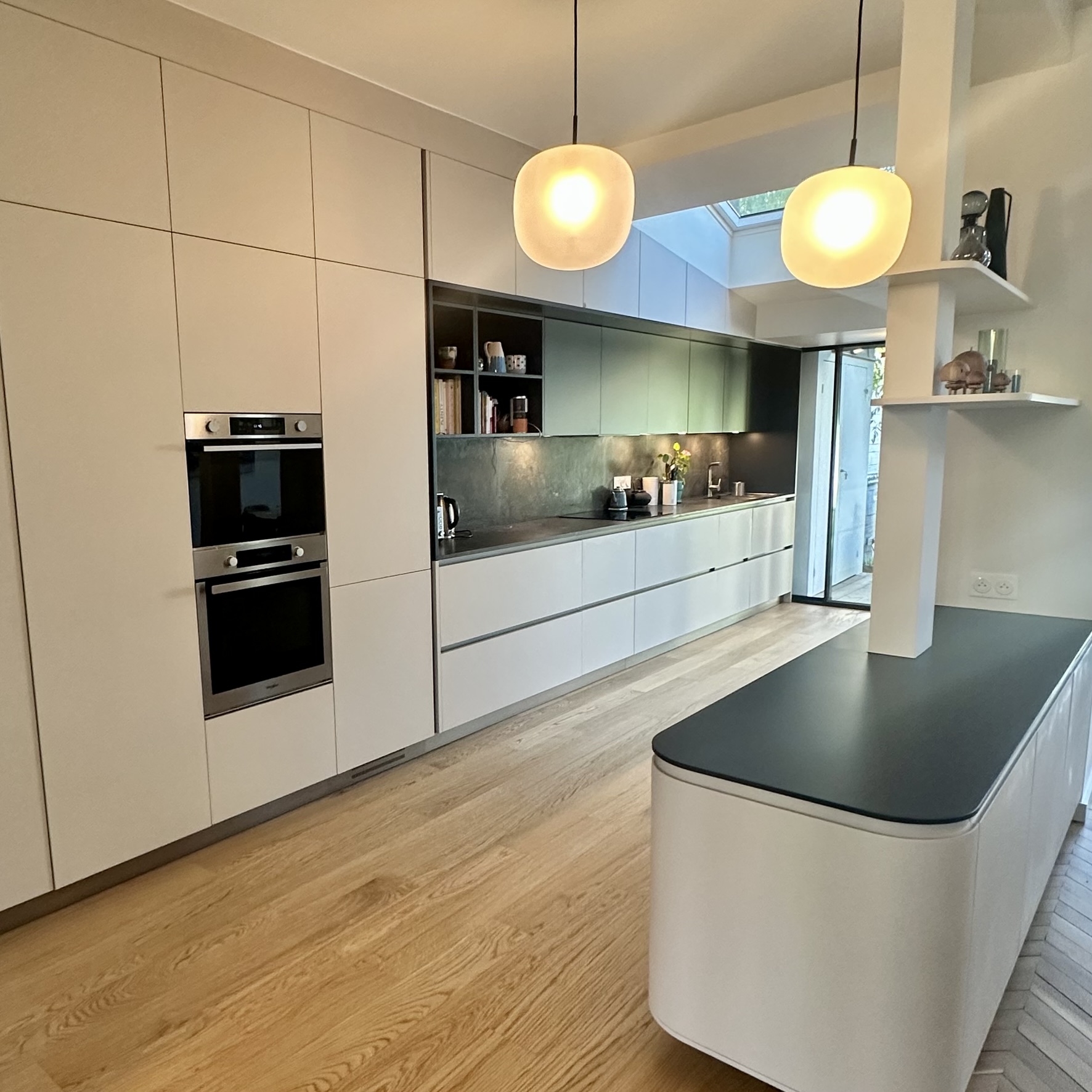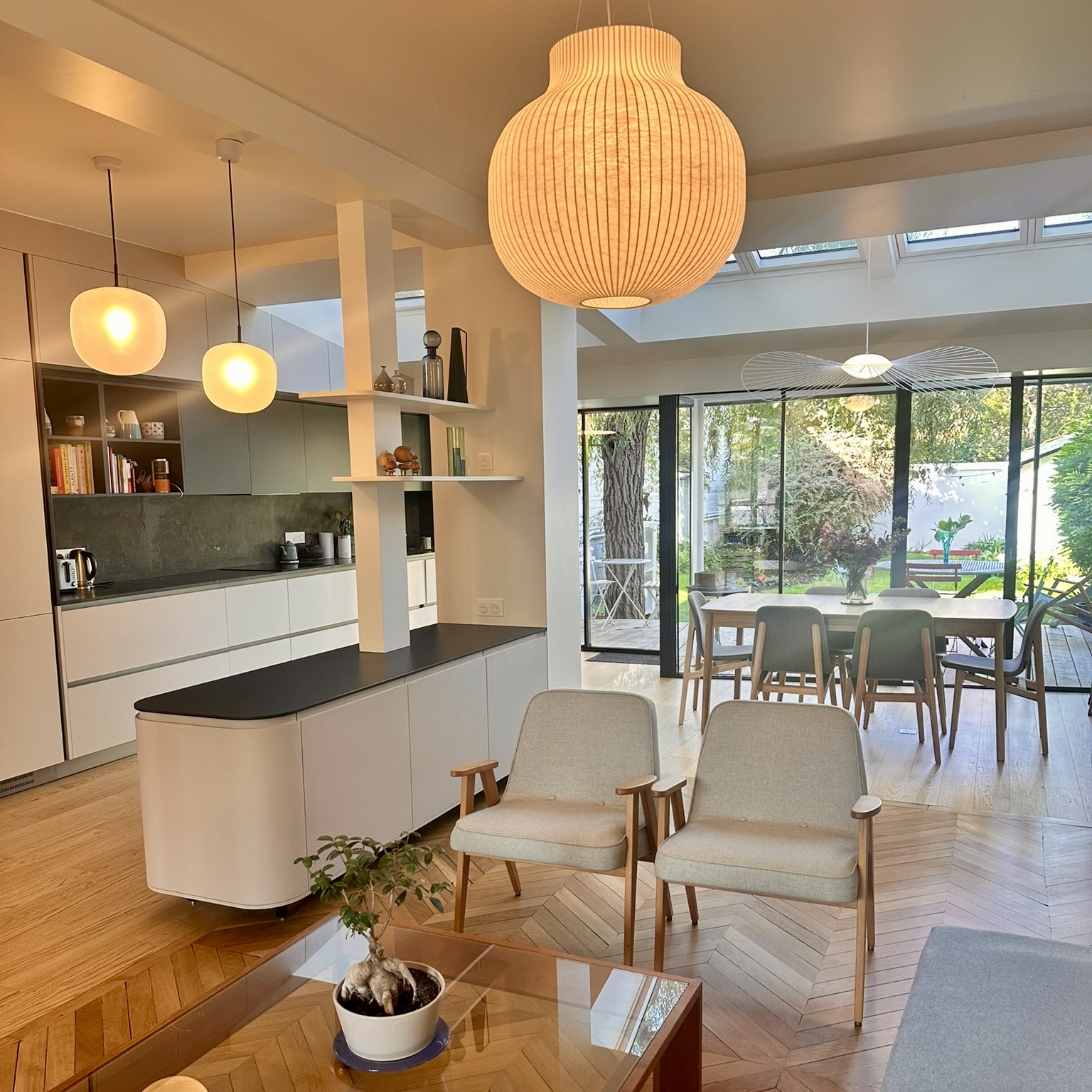 L’intervention a regroupé en un seul volume les pièces du Rez-de-chaussée comme un grand loft traversant de la rue au jardin. Au Sud une circulation active qui regroupe les fonctions de services, entrée vestiaire, cuisine. Au Nord les espaces de convivialité propices au «farniente». A l’Ouest une transition douce par une serre vous accompagne jusqu’au jardin.