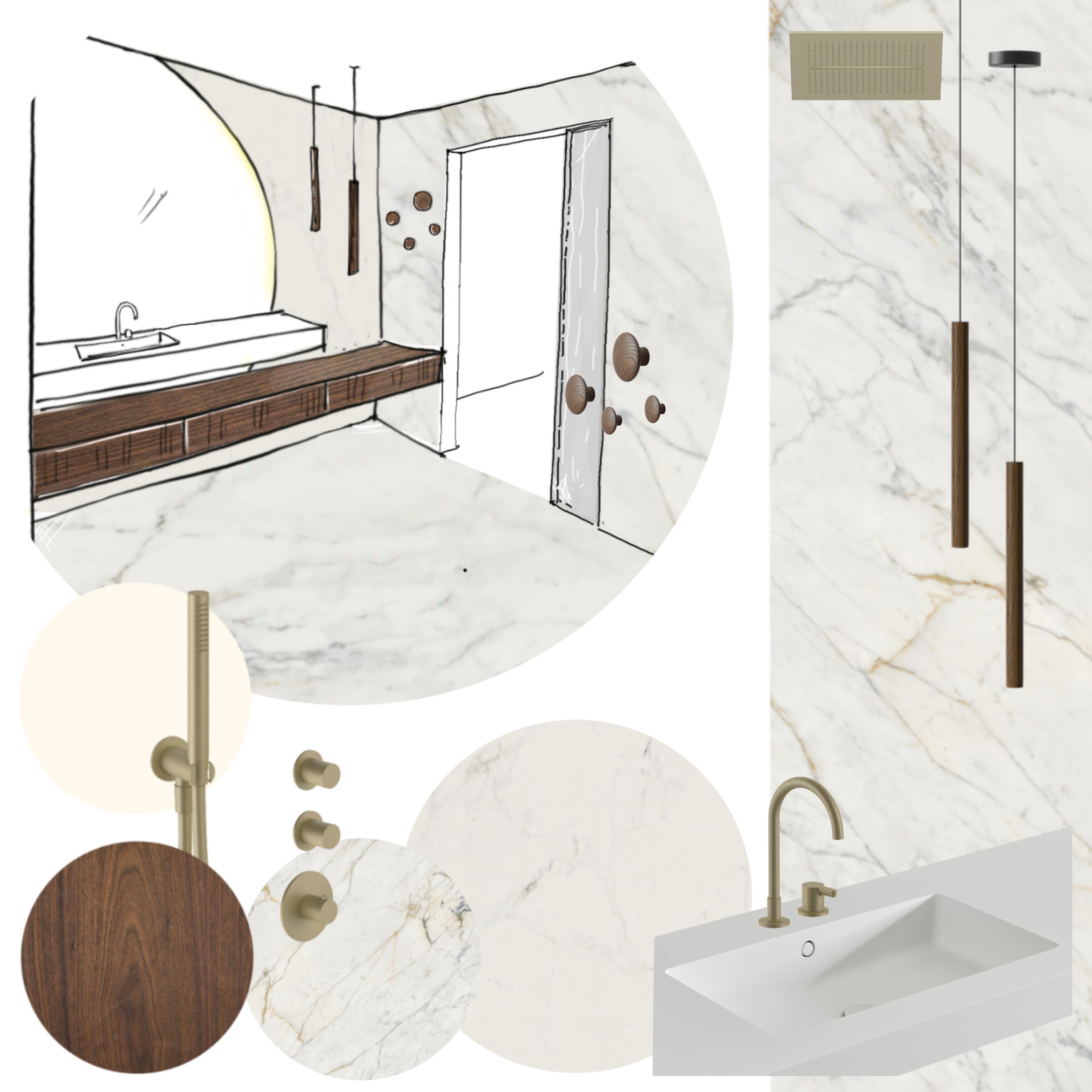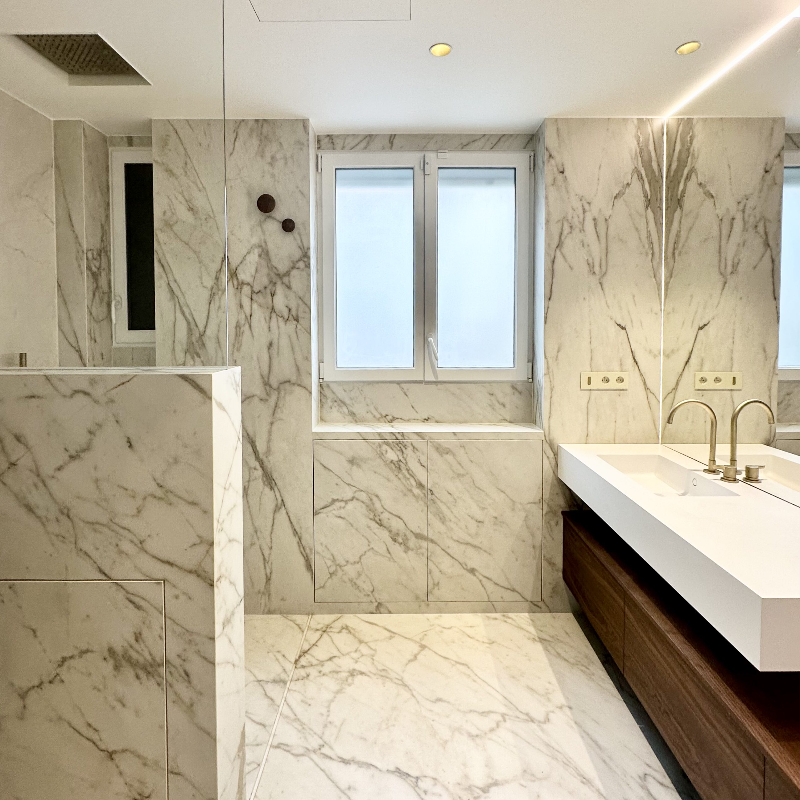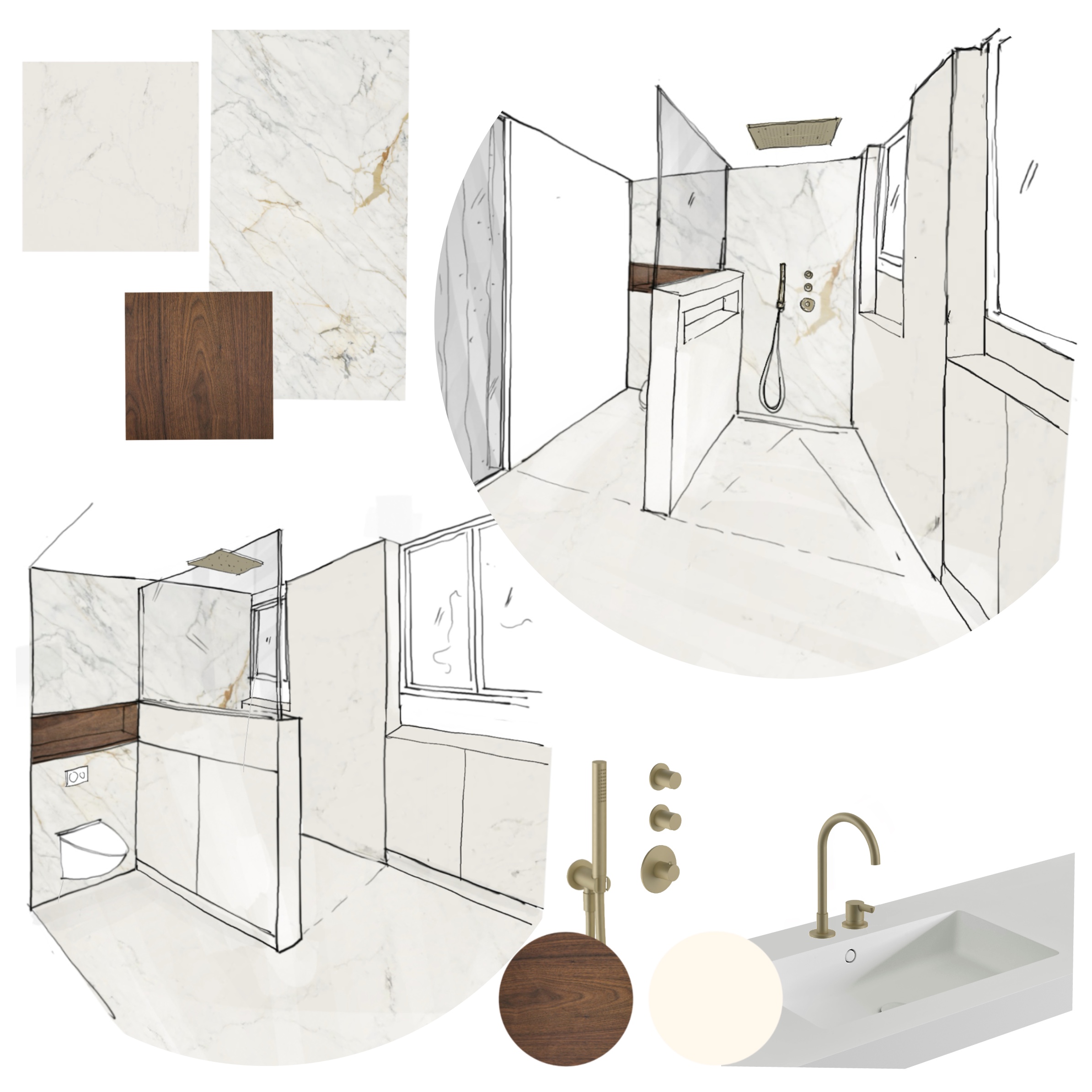 Dans une volumétrie donnée une salle de bain et une salle de douche différentes par leur usage ont des identités similaires et sont aménagés et mises en valeur comme des écrins sophistiqués et minimales à la fois.