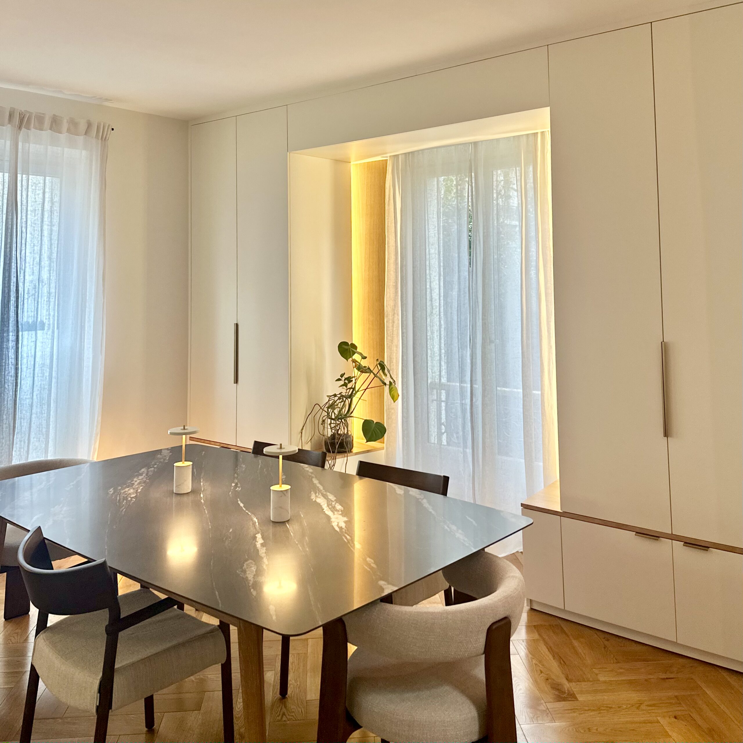 Les Heures Maison ont procédé par touche ciblée à des aménagements de certains espaces d’une demeure particulière à St Mandé. La compréhension des attentes du client par l’architecte d’intérieur a permis de proposer des mobiliers en accord avec l’existant comme une suite esthétique, fonctionnelle et spatiale logique, dans laquelle existant et apports cohabitent harmonieusement.